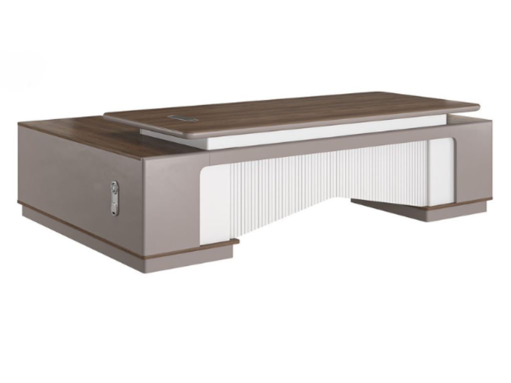 Bàn lãnh đạo LUXURY SUPREME S5 chất liệu gỗ sơn + melamine, hộc và tủ phụ liền bàn Ngăn kéo sử dụng khóa vân tay. Yếm bàn soi chỉ trang trí ốp ngoài sơn trắng. Sản phẩm kết hợp vân gỗ, sơn ghi, trang trí thêm màu trắng. Mặt bàn có 01 nắp hộp điện, kết hợp đi dây hiện đại, tiện ích.