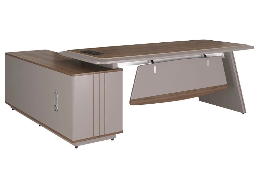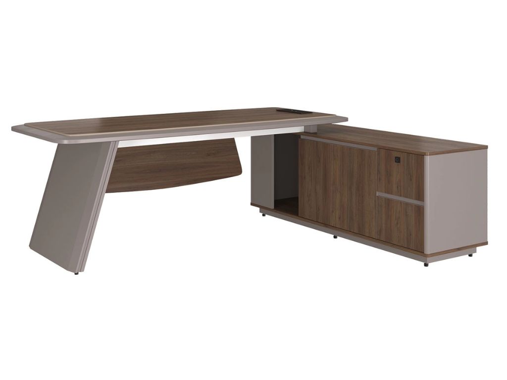 Bàn lãnh đạo LUXURY SUPREME S3 chất liệu gỗ sơn+ melamine. Mặt bàn hình tang trống. có 01 nắp hộp điện, Kiểu dáng hiện đại, sang trọng, góc cạnh mặt bàn được bo tròn đều. Tủ phụ có kèm khóa cảm ứng vân tay tại ngăn kéo.