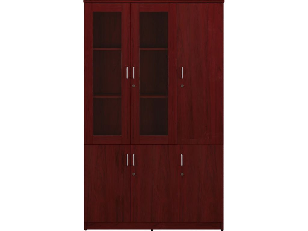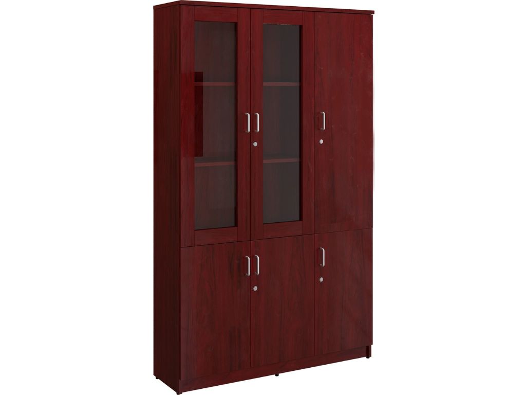 Tủ tài liệu 3 khoang: phía trên gồm 2 cánh khung kính để tài liệu và 1 khoang treo áo; phía dưới có 3 cánh mở có khóa.